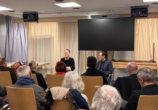 Dominik Frank (Vorstand Förderverein) modertierte das erste Habibis Kiosk Gespräch in 2024 mit Stefanie Rendtorff & Elias Krischke.
